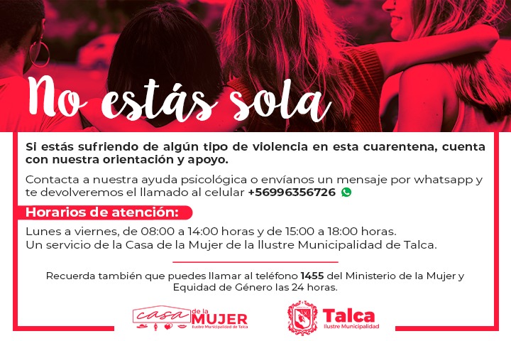 De esta forma, la Casa de la Mujer de la Ilustre Municipalidad de Talca ha habilitado el teléfono +56996356726, disponible de lunes a viernes de 08:00 a 14:00 horas y de 15:00 a 18:00 horas. Allí, las mujeres serán atendidas por un psicólogo quien las orientará y ayudará ante la presencia de violencia en cualquiera de sus formas. También, las mujeres afectadas podrán enviar un mensaje a través de Whatsapp solicitando ser contactadas.