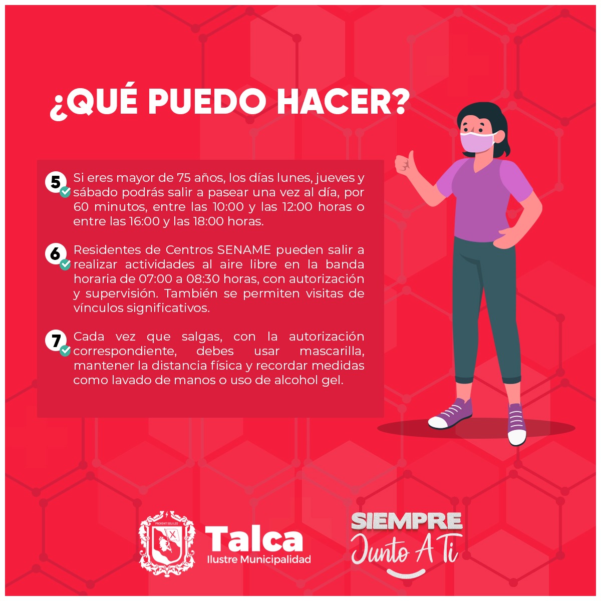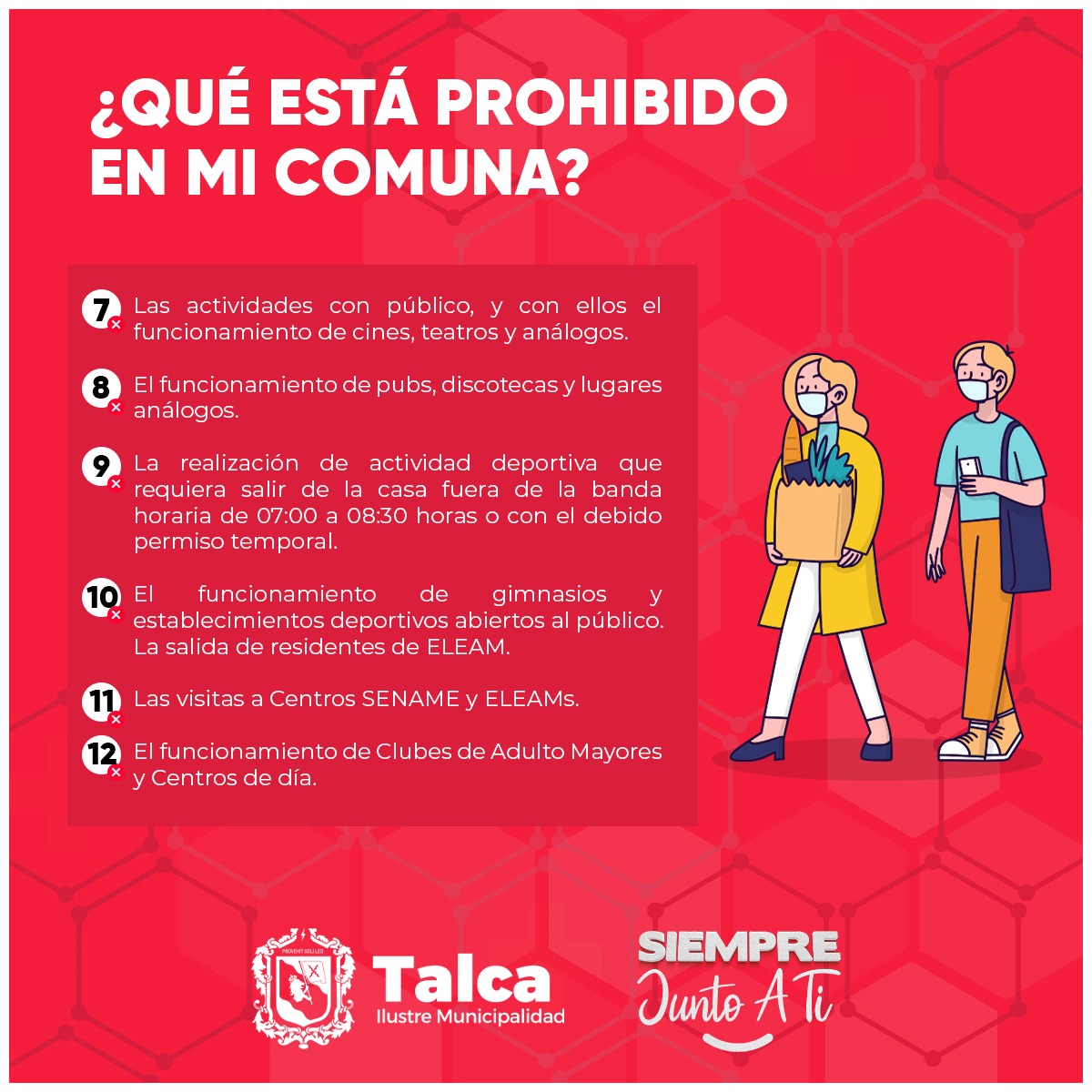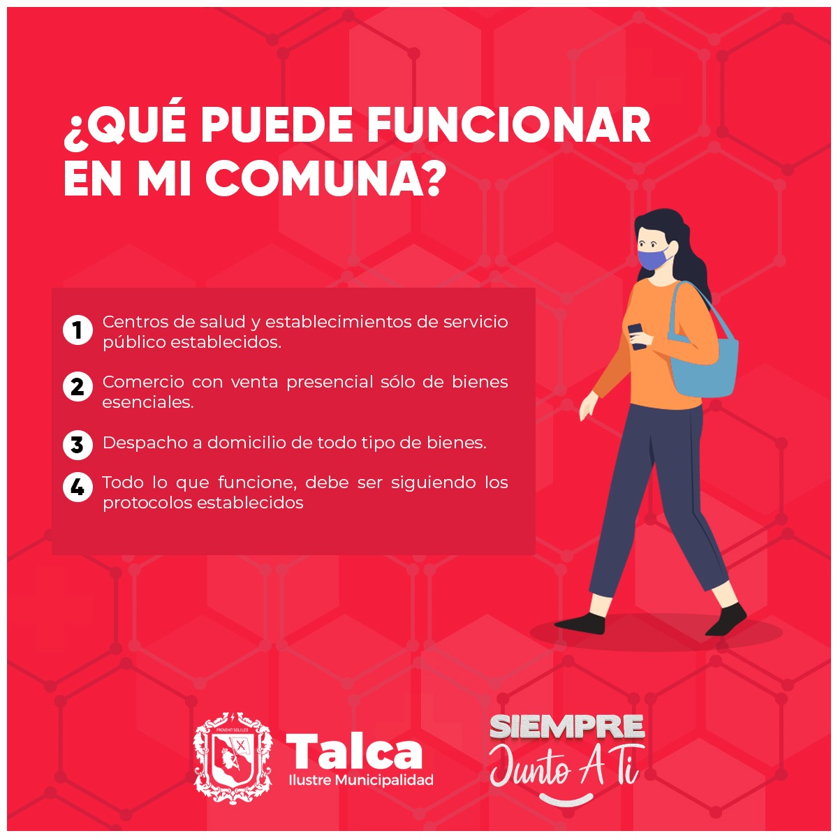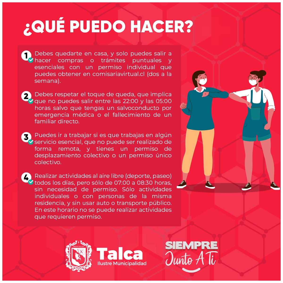 Cabe señalar que en la comuna de Talca, el retroceso a cuarentena total, implica que las personas solo pueden salir a hacer compras o trámites puntuales y esenciales con un permiso individual que se puede obtener en comisariavirtual.cl, pudiendo solicitar dos por semana.