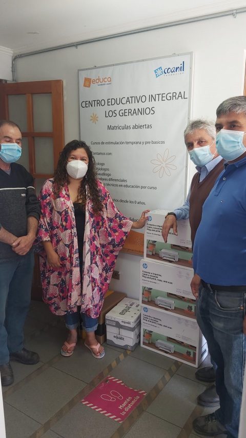 La Unidad de Construcción Municipal, fue representada por los funcionarios, Claudio Díaz, Antonio Carrasco, Manuel Cancino y Eduardo Lobos, quienes entregaron a la Escuela Diferencial “Los Gerianos”, materiales de escritorio como 3 Multifuncionales HP 2375 con tintas incluidas; 1 caja de resmas tamaño oficio y 1 caja de resmas tamaño carta.