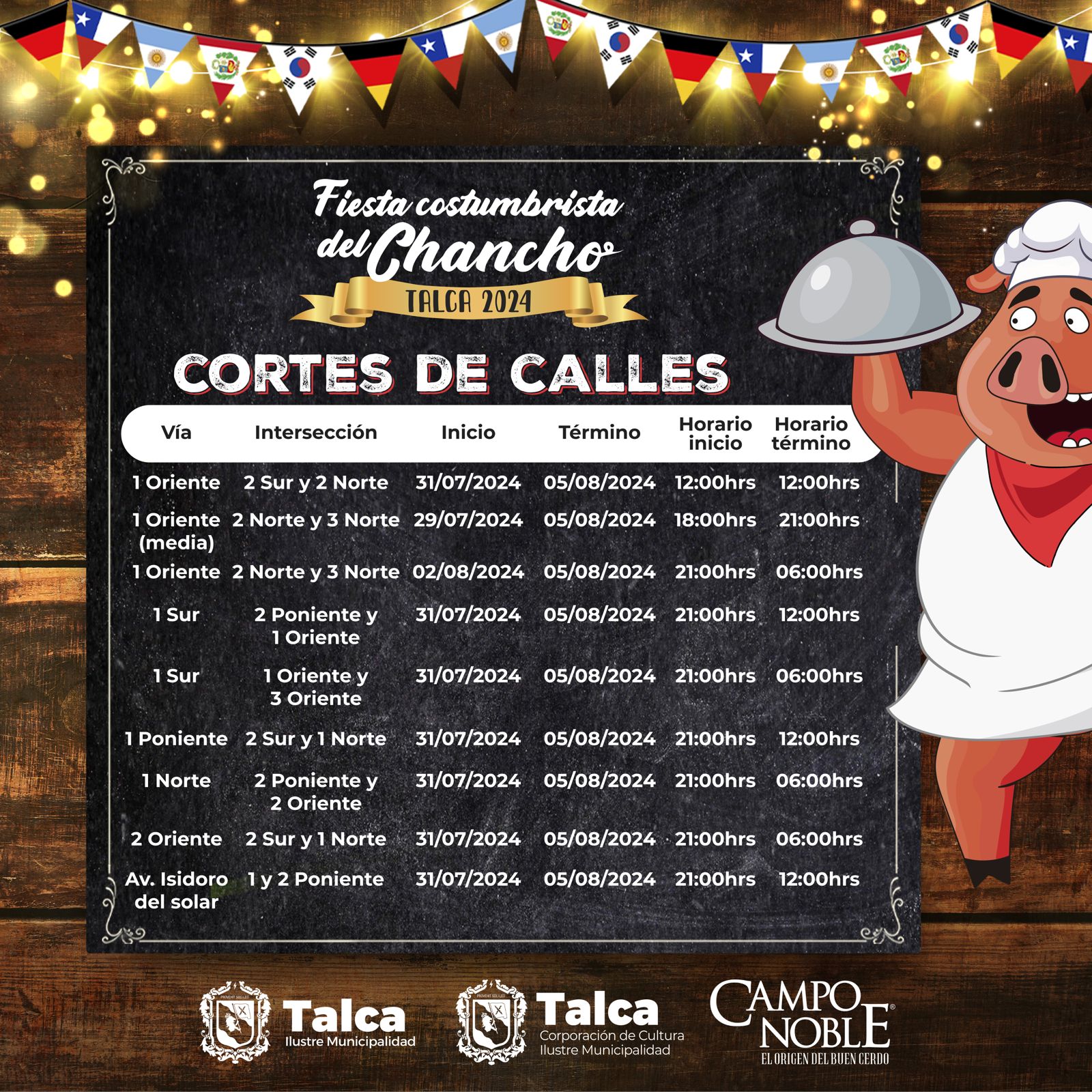 Este sábado comienza la Fiesta Costumbrista del Chancho 2024, una actividad de enormes dimensiones que espera recibir a 300 mil personas y se realiza en múltiples calles del centro de la ciudad. Para su realización se consideran diferentes cortes de calles las cuales comienzan a ser intervenidas de manera paulatina a contar de hoy lunes.