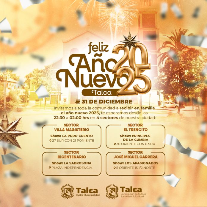 La Municipalidad de Talca ha preparado una especial celebración para recibir el Año Nuevo 2025, ofreciendo cuatro eventos musicales gratuitos en distintos sectores de la ciudad. La iniciativa busca brindar un espacio de entretención seguro para los vecinos, promoviendo una celebración inclusiva y cercana.