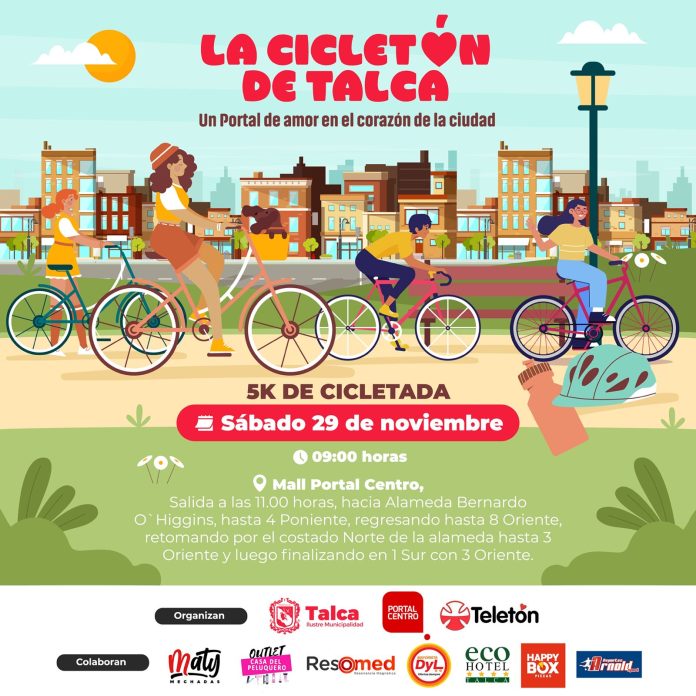 La Municipalidad de Talca, a través de su Corporación Municipal de Deportes, junto al Mall Portal Centro y Teletón, anunció la realización de la “Cicletón de Talca: Un Portal de amor en el corazón de la ciudad”, una actividad familiar que buscará reunir a la comunidad en torno al deporte, la solidaridad y la inclusión. El evento se realizará el sábado 29 de noviembre desde las 09:00 horas, y tendrá como principal objetivo apoyar la campaña Teletón que se llevará a cabo los días 28 y 29 de noviembre a nivel nacional.